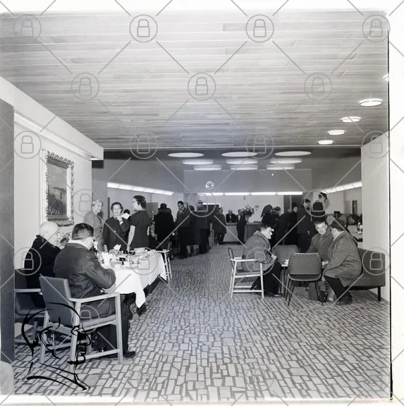 inomhus, restaurang, människor, bord, stolar, mat, dryck, 1960-tal, svartvit, interiör, samtal, socialt, väggkonst, belysning, golv, kläder, möbler, atmosfär, samling, evenemang