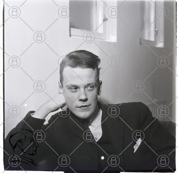 man, porträtt, svartvitt, kläder, 1940-tal, stil, ungdom, eftertänksam, inomhus, möbler, fönster, ansiktsuttryck, elegant, mode, fotografi, nostalgi, vintage, sittande, arm, hand, kavaj, skjorta, hår, blick, uttryck, tidsepok, klassisk, stilren, personlig
