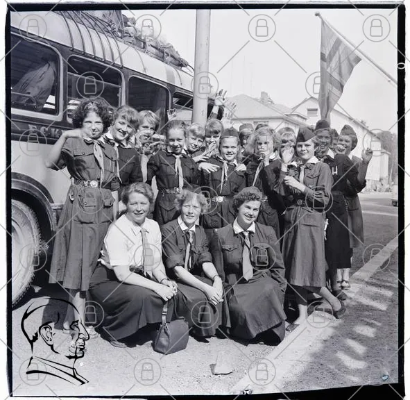 flickor, gruppfoto, buss, uniformer, flagga, utomhus, svartvitt, 1950-tal, scout, resa, glada, leenden, väg, sommar, retro, historisk, kläder, väska, kvinnor, ungdomar