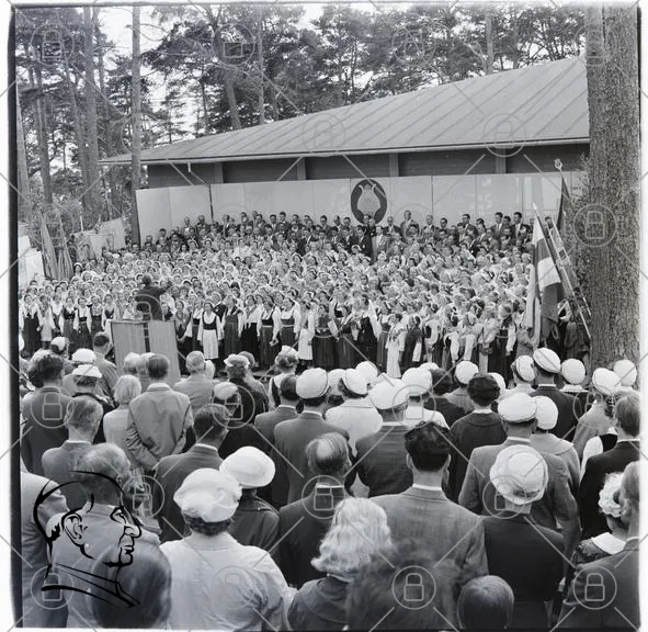kör, utomhus, publik, dirigent, skog, träd, byggnad, flaggor, traditionella kläder, hattar, samling, evenemang, sång, konsert, människor, grupp, scen, mikrofon, tal, musik, kultur, ceremoni, sommar, natur, allsång, folkdräkt, högtid, festlighet, gemenskap, nationaldag
