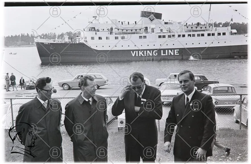 Viking Line, båt, hamn, män, kostymer, svartvitt, 1960-tal, sjöfart, skärgård, fotografering, event, historia, resor, passagerarfartyg, marin, landskap, bilar, kläder, stil, tradition, samarbete, företag, logotyp, sjö, människor, grupp, ceremoni, presentation, transport