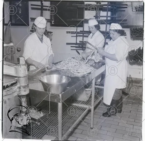 kök, kvinnor, arbete, fiske, matlagning, industri, 1950-tal, kläder, bänkar, redskap, skärbrädor, fiskskärning, hygien, arbetsmiljö, tradition, hantverk, råvaror, förberedelse, restaurang, livsmedel, teamwork, professionellt, historiskt, svartvitt, lokal, produktion, köksutrustning, arbetskläder, mat, skaldjur