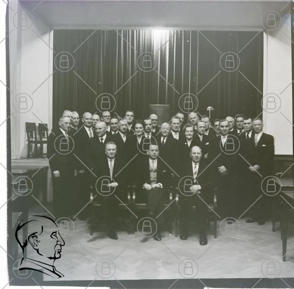 grupp, män, kvinnor, kostymer, svartvitt, möte, porträtt, inomhus, stolar, bakgrund, formell, 1900-tal, affärsmän, samling, traditionell, kläder, leenden, professionell, konferens, stil, samarbete, organisation, gemenskap, historia, fotografi, representation, ledarskap, evenemang, socialt, nätverk