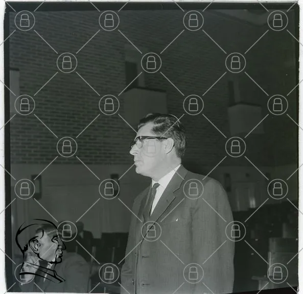 man, kostym, glasögon, möte, inomhus, 1960-tal, stolar, väggar, tegel, formell, diskussion, stående, bakgrund, svartvitt, kontor, professionell, allvarlig, presentation, publik, ledarskap