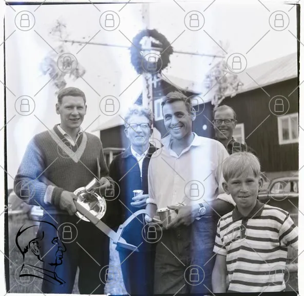 tävling, pris, familj, gård, sommar, män, kvinna, barn, trofé, tradition, fest, glädje, samling, landsbygd, svartvitt, historisk, skratt, gemenskap, dekoration, kors, tröja, skjorta, byxor, leende, minnen, 1960-tal, festligheter, natur, utomhus, fotografering