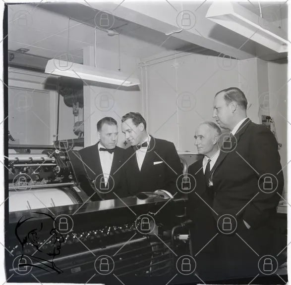 tryckpress, män, kostymer, svartvitt, teknik, industri, möte, 1950-tal, affärsmän, tryckning, maskin, kontor, professionellt, diskussion, traditionell, papper, tryckerikultur, historisk, företag, innovation