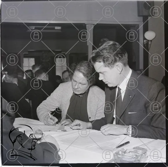 möte, diskussion, skrivande, papper, människor, 1950-tal, inomhus, kläder, man, kvinna, dokument, anteckningar, bord, samarbete, svartvitt, historisk, socialt, interaktion, fokus, uttryck, professionellt, kontor, grupp, aktivitet, traditionell, formell, kommunikation, analys, forskning, studier, presentation