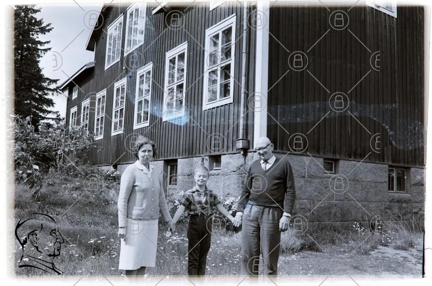 familj, svartvitt, gammal bild, hus, fönster, gräs, blommor, man, kvinna, pojke, kläder, 1960-tal, utomhus, sommar, tradition, minnen, generationer, landskap, natur, hållande händer, leende, fotografi, nostalgi, svensk, kultur, historia, familjeband, gemenskap, barn, vuxna