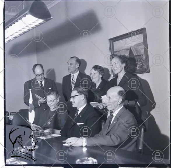 möte, grupp, människor, kontor, flagga, dokument, svartvitt, 1950-tal, kläder, leenden, bord, inomhus, professionell, porträtt, samarbete, presentation, kvinnor, män, affärsmöte, historia, tradition, fotografi, samling, diskussion, formalitet, interaktion, kultur, representation, ledarskap, gemenskap, evenemang