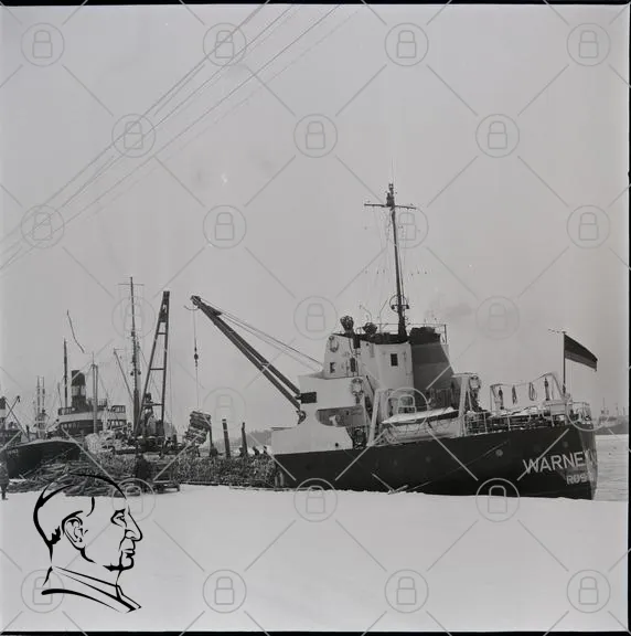 fartyg, hamn, is, lastning, WARNEY, båtar, industri, transport, sjöfart, flaggor, vinter, arbete, last, kaj, hav, maskiner, byggnader, elledningar, svartvitt, historisk, sjö