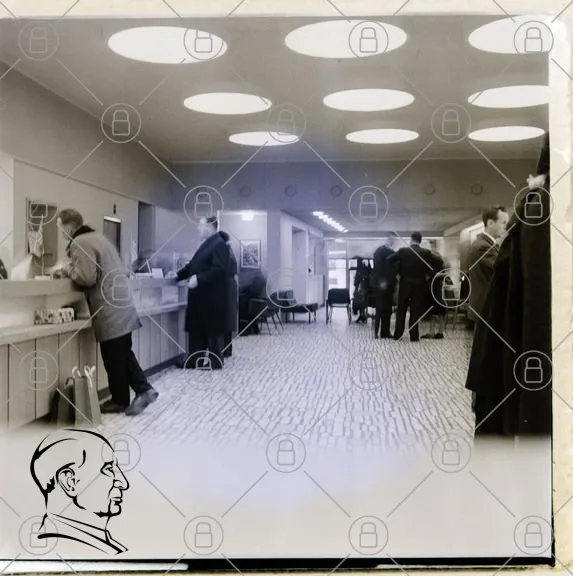 inomhus, svartvit, människor, kontor, reception, 1960-tal, möbler, golv, väggar, belysning, samtal, kö, affär, stil, retro, arkitektur, fönster, stolar, skrivbord, dokument, väntan