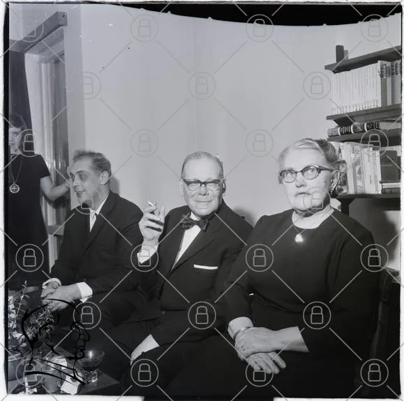fest, 1950-tal, kläder, glasögon, smoking, kvinna, man, inomhus, möbler, bokhylla, växt, cigarett, svartvitt, sällskap, socialt, stil, elegans, retro, porträtt, samtal, leende, stämning, vintage, accessoarer, bord, interiör, klassisk, traditionell, samling
