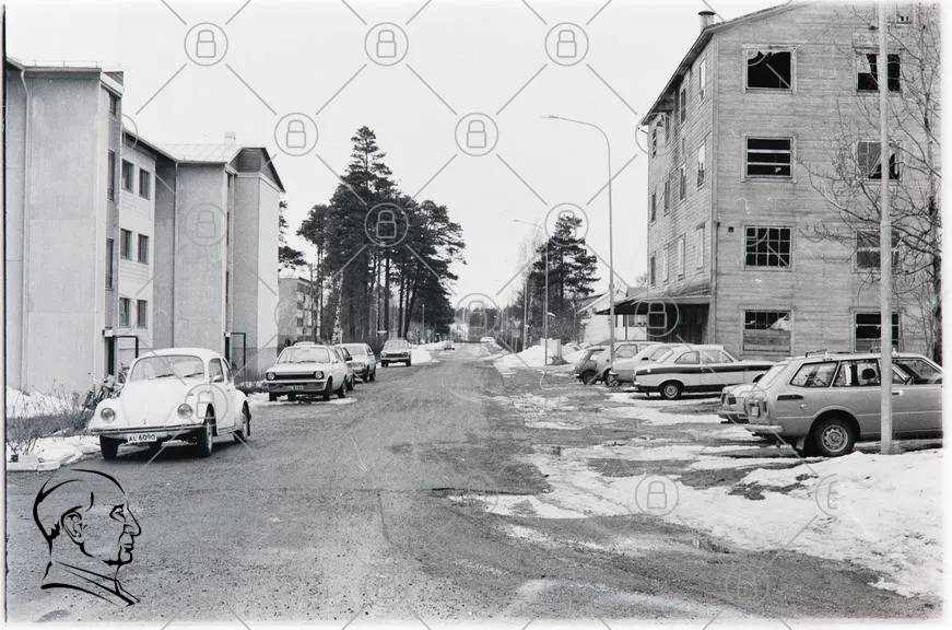 gata, bilar, träd, byggnader, vinter, snö, asfalt, lampor, svartvitt, landskap, bostadsområde, väg, parkering, arkitektur, natur, stadsmiljö, stillhet, 1970-tal, retro, urban
