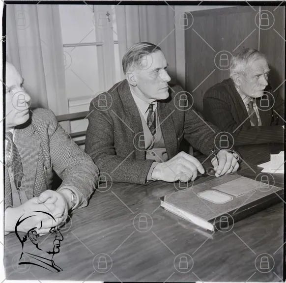 möte, män, bord, diskussion, kläder, kostymer, 1940-tal, svartvitt, ansiktsuttryck, koncentration, dokument, skrivbord, inomhus, formell, äldre, professionell, interaktion, samhälle, historia, grupp, fokus, uttryck, stil, tradition, samarbete, ledarskap, beslut, kommunikation, presentation