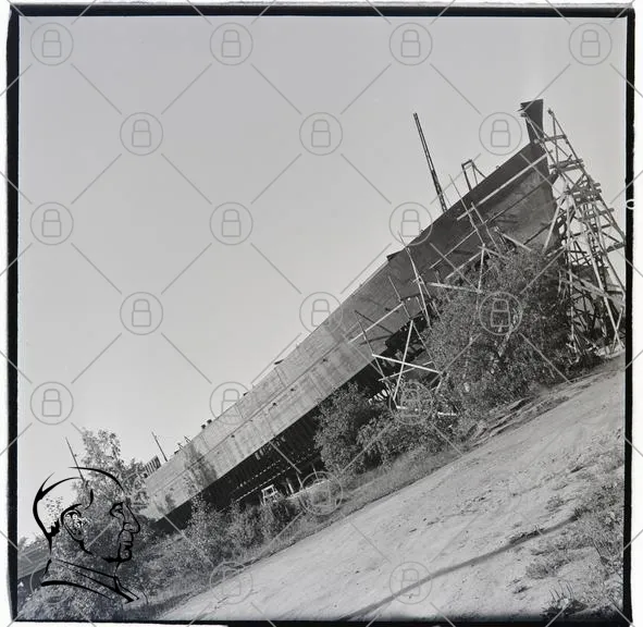 skeppsbygge, fartyg, konstruktion, ställning, träd, himmel, svartvitt, utomhus, skepp, byggplats, skrov, landskap, industri, arbetsplats, trä, metall, verktyg, byggnadsställning, horisont, vegetation