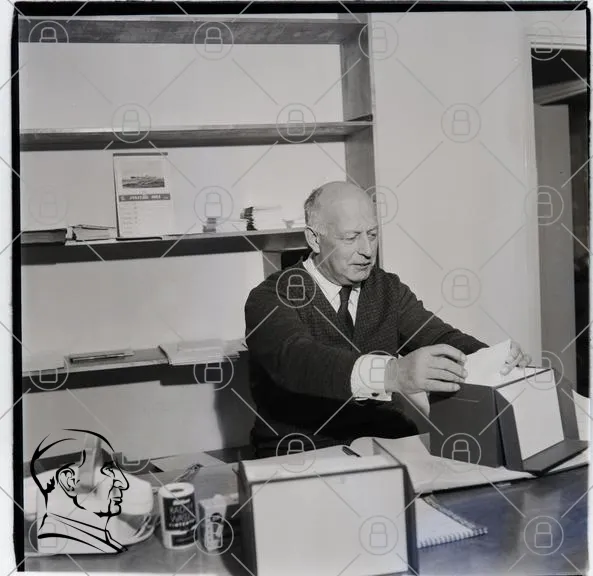 man, kontor, skrivbord, papper, dokument, låda, telefon, anteckningsblock, svartvitt, 1900-tal, affär, administration, kontorsmaterial, arbetsmiljö, professionell, affärsman, kontorsarbete, kontorsinredning, skrivmaskin, kontorsutrustning