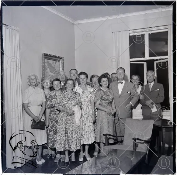 grupp, människor, inomhus, svartvit, kläder, 1950-tal, porträtt, leenden, möte, äldre, kvinnor, män, stolar, fönster, väggkonst, socialt, samling, traditionell, fest, gemenskap, familj, stil, klänningar, kostymer, interiör, fotografi, minnen, vänskap, samhörighet
