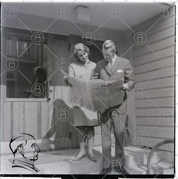 tidning, man, kvinna, läsning, ytterdörr, kläder, 1960-tal, svartvitt, par, intresse, information, nyheter, utomhus, hem, stil, mode, interaktion, ansiktsuttryck, cykel, trappa, fönster, entré, samtal, hållning, kroppsspråk, vintage, retro, socialt, kultur, kommunikation