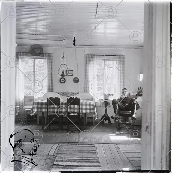 rum, inredning, möbler, bord, stolar, fönster, gardiner, lampa, golv, matta, person, fåtölj, väggar, tavlor, kök, hemtrevligt, svartvitt, vintage, stil, hem, ljus, natur, trä, duk, avkoppling, atmosfär, traditionell, landsbygd, enkelhet