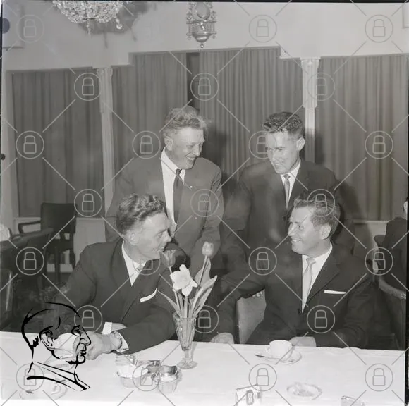 män, kostymer, bord, blommor, kaffe, leende, 1950-tal, inomhus, möte, fest, svartvitt, samtal, eleganta, stolar, gardiner, ljuskrona, vänner, affärsmän, socialt, samarbete
