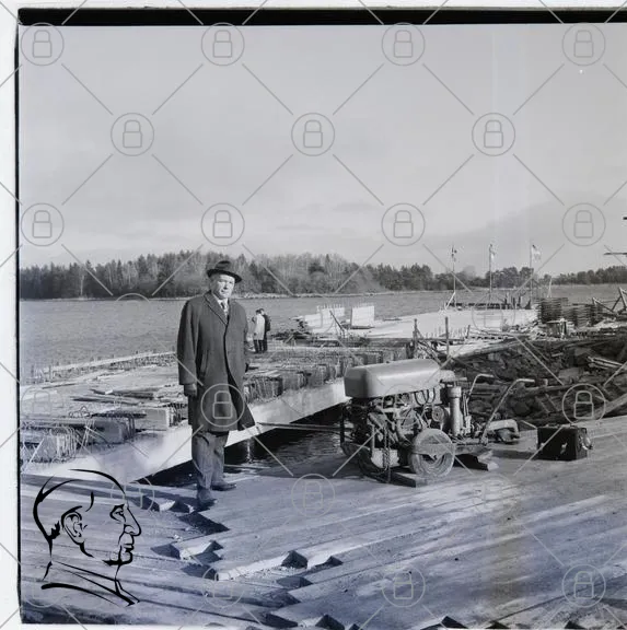 man, brygga, båt, motor, vatten, träd, flaggor, svartvitt, byggnation, landskap, kläder, 1900-tal, hav, kaj, industri, arbete, natur, historia, gammal, fotografi