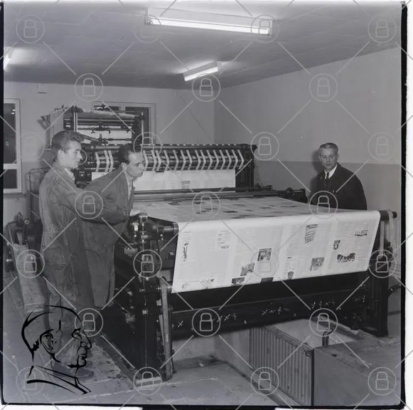 tryckpress, tidning, tryckare, man, arbete, svartvitt, industri, papper, maskin, 1900-tal, kontor, tryckeri, teknik, professionell, historisk, verkstad, publicering, nyheter, press, arbetsmiljö