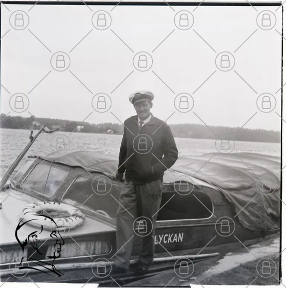 båt, kapten, sjö, lycka, man, hatt, vatten, strand, segling, sommar, natur, landskap, gammal, svartvit, fotografi, båtklubb, fritid, tradition, avkoppling, hobby