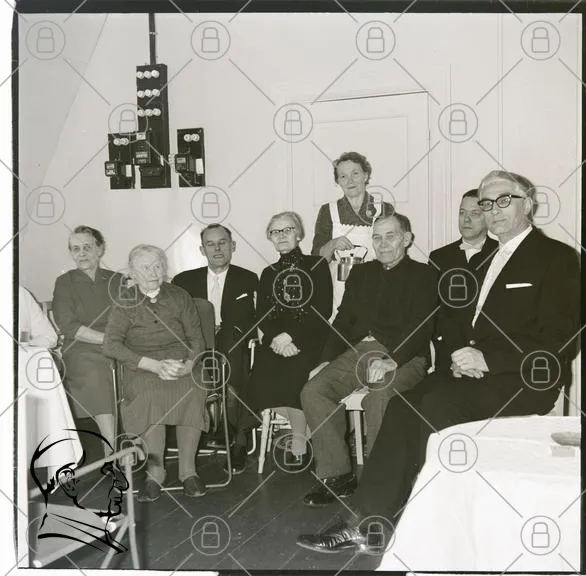 grupp, människor, svartvitt, inomhus, äldre, kläder, möte, leende, bord, stolar, kvinna, man, traditionell, familj, samling, 1900-tal, interiör, fotografi, ansikten, gemenskap, historia, minnen, socialt, samvaro, fest, sällskap, äldre personer, klänningar, kostymer, heminredning