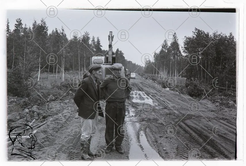 män, skog, väg, maskin, arbete, landskap, trä, lerig, kläder, hattar, samtal, byggarbetsplats, fordon, natur, svartvitt, fotografering, trädfällning, jord, grus, miljö, traditionell, landsbygden, män i arbete, skogsarbete, tunga maskiner, vägbygge, skogsbruk, historisk, utomhus, samarbete