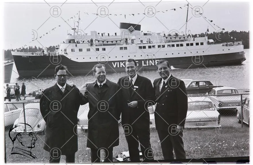 Viking Line, färja, män, kostymer, svartvitt, hamn, båt, 1960-tal, gruppfoto, sjöfart, skärgård, resor, maritim, historia, företag, logotyp, kläder, stil, fotografering, landskap, träbilar, flaggor, tradition, samarbete, evenemang, fest, minnen, nostalgi, transport, sjö