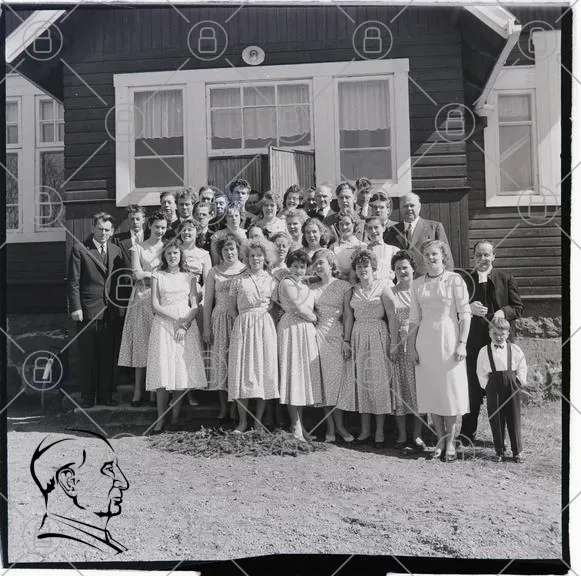 grupp, människor, svartvitt, kläder, 1950-tal, fest, leenden, byggnad, tradition, porträtt, kvinnor, män, barn, skolavslutning, gemenskap, glädje, vintage, familj, samling, stil, retro, fotografering, utomhus, landskap, historisk, kultur, minnen, samhörighet, evenemang