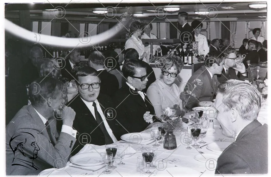 middag, fest, svartvitt, klädd, bord, vin, glas, servitör, gäster, eleganta, dekoration, blommor, klänningar, kostymer, restaurang, socialt, 1960-tal, samling, mat, dryck, samtal, belysning, atmosfär, evenemang, stil, tradition, nöje, sällskap