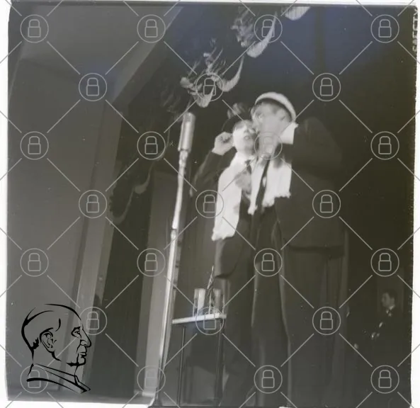 teater, skådespelare, kostymer, mikrofon, scen, underhållning, komedi, föreställning, publik, kläder, hattar, svartvitt, 1900-tal, manliga skådespelare, humor, dramatik, teaterpjäs, scenkonst, artist, uppträdande, teaterljus, repliker, skämt, mimik, gestikulation, scenografi, föreställningskonst, tradition, kultur, teaterhistoria
