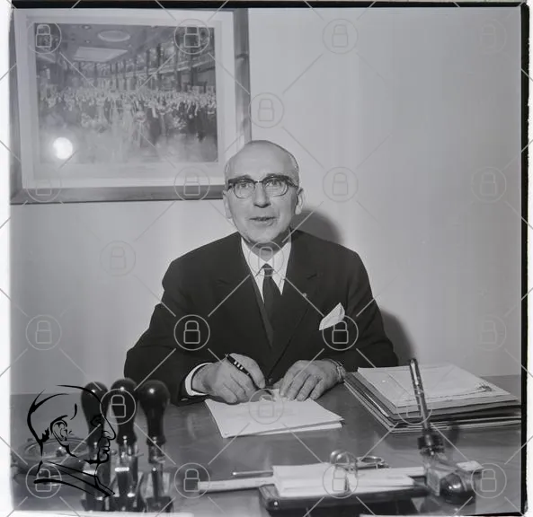 man, kontor, skrivbord, dokument, stämplar, kostym, glasögon, porträtt, affärsmann, 1900-tal, svartvitt, professionell, inomhus, möbler, väggkonst