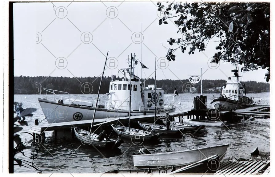 båt, hamn, vatten, träbåtar, motorbåt, Esso, flaggor, brygga, skog, landskap, svartvit, sjöfart, båtliv, kaj, båtar, transport, marina, sommar, natur, reflektioner, himmel, moln, stillhet, fritid, sjö, båtliv, tradition, kultur, historia