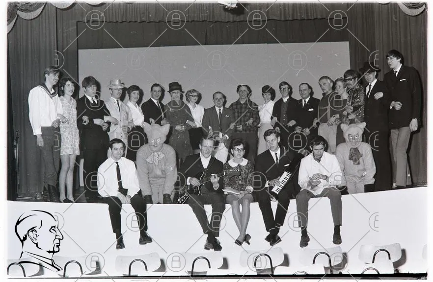grupp, människor, scen, kostymer, 1960-tal, svartvitt, underhållning, musik, kläder, leenden, instrument, clown, fotografering, fest, teater, show, publik, stil, retro, komedi, skådespelare, samling, evenemang, tradition, kultur, skratt, vänskap, gemenskap, minnen, nostalgi