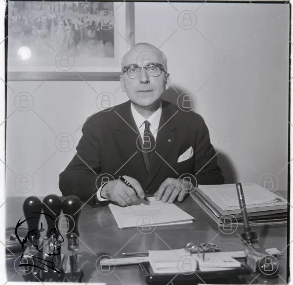 man, skrivbord, kontor, dokument, penna, glasögon, kostym, svartvitt, stämplar, papper, skrivande, professionell, affärsmann, inredning, porträtt, 1900-tal, formell, arbetsmiljö, kontorsutrustning, fotografi