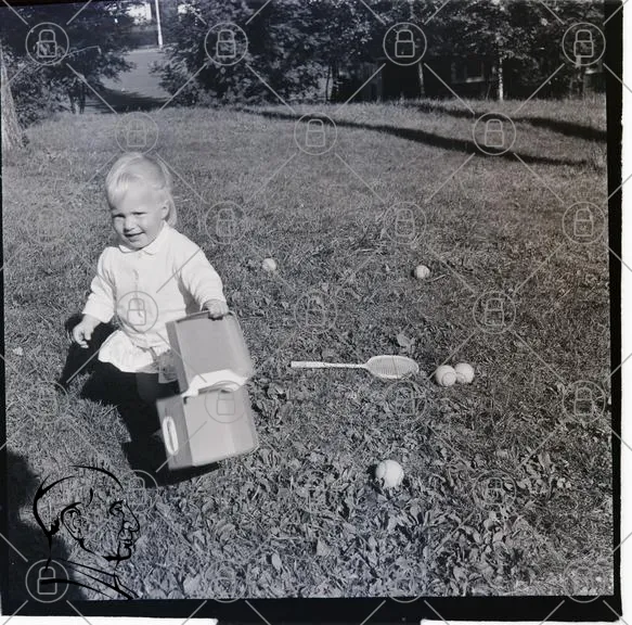 barn, gräs, leksak, racket, bollar, utomhus, sommar, träd, skugga, lek, glädje, svartvitt, fotografi, park, natur