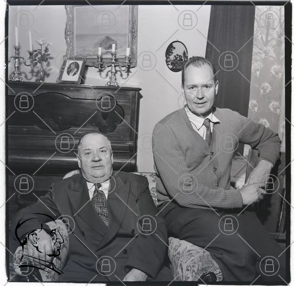män, porträtt, svartvitt, inomhus, möbler, soffa, gammal, kläder, familj, tradition, 1950-tal, heminredning, fotografi, ansikten, stil, historia, interiör, belysning, väggar, konstverk, känslor, samvaro, generationer, äldre, yngre, uttryck, minnen, nostalgi, kultur, relationer