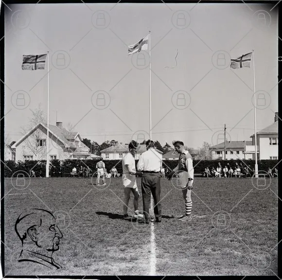 fotboll, domare, spelare, match, flaggor, gräsplan, publik, sport, lag, tävling, utomhus, sommar, handskakning, tröjor, fotbollsskor, idrott, tradition, samhälle, fritid, ungdomar
