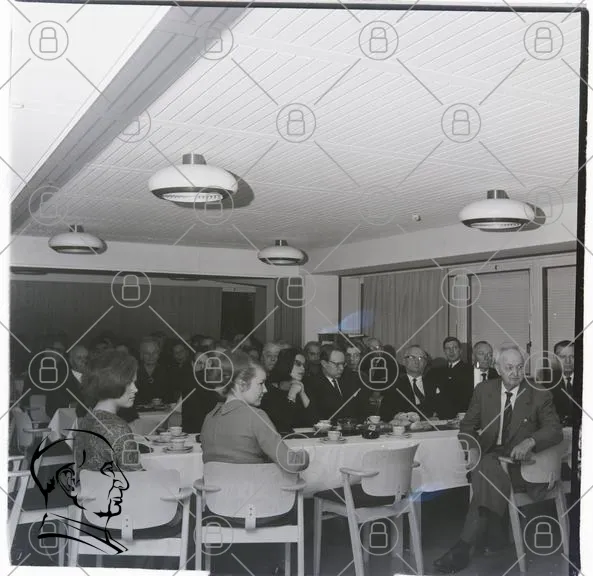möte, konferens, människor, inomhus, bord, stolar, kaffe, te, diskussion, kläder, 1960-tal, svartvitt, samling, presentation, samtal, grupp, ledare, föreläsning, socialt, interaktion, evenemang, restaurang, lokal, belysning, fönster, väggar, tak, atmosfär