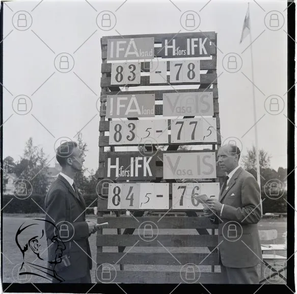 IFA, H-fors, IFK, Vasa, 83, 78, 83, 77, 5, 84, 76, sport, tävling, resultat, skylt, män, kläder, träd, flagga, utomhus, 1900-tal, svartvit