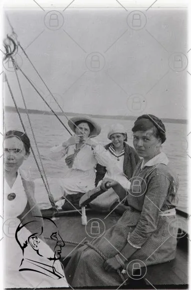 båt, kvinnor, segling, vintage, svartvit, kläder, 1900-tal, sjö, sommar, hattar, leende, fotografering, natur, vänner, avkoppling, traditionell, historisk, grupp, landskap, nöje