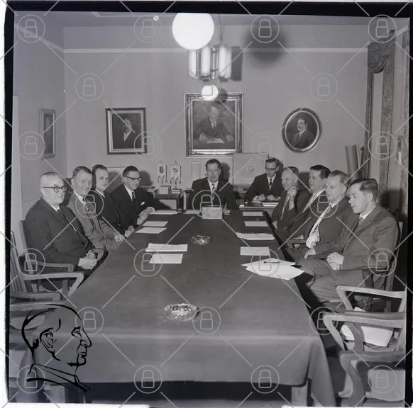 möte, konferens, män, bord, kostymer, 1960-tal, svartvitt, porträtt, dokument, stolar, belysning, väggar, inomhus, affärsmän, diskussion, grupp, professionell, formell, samarbete, ledarskap