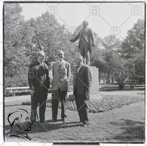 staty, park, träd, män, kostymer, svartvitt, monument, gräs, blommor, 1950-tal, historisk, samling, fotografering, utomhus, kultur, konst, vänner, tradition, staty av man, socialt sammanhang