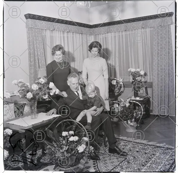 familj, barn, man, kvinnor, blommor, inredning, fotografi, 1900-tal, möbler, hem, tradition, porträtt, interiör, korgar, matta, fönster, gardiner, leende, samvaro, generationer, kärlek, minnen, fest, högtid, svartvitt, nostalgi, familjeband, glädje, samling