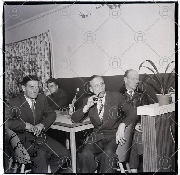 män, kostymer, bord, stolar, växter, inomhus, restaurang, gardiner, rökning, pipa, grupp, samling, möte, interiör, 1950-tal, retro, svartvitt, socialt, samtal, avslappnat