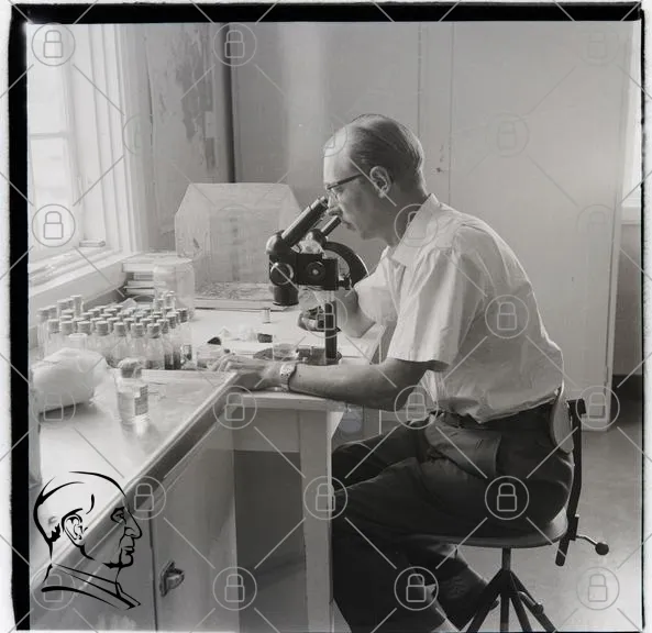 mikroskop, forskare, laboratorium, vetenskap, analys, prover, glasbehållare, skrivbord, forskning, svartvitt, man, kläder, glasögon, sittande, observation, experiment, teknik, medicin, biologi, studera, detaljer, noggrannhet, arbetsmiljö, professionell, fokus, arbete, 1900-tal, forskningsteknik, laboratorieutrustning, vetenskaplig metod, mikroskopi