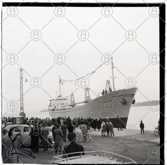 fartyg, hamn, människor, flaggor, 1950-tal, svartvitt, bilar, cyklar, kaj, sjöfart, NORDO, fest, samling, båtar, lastfartyg, industri, hav, transport, tradition, ceremoni, fotografering, historia, kust, landskap, byggnader, väder, dimma, aktivitet, sällskap
