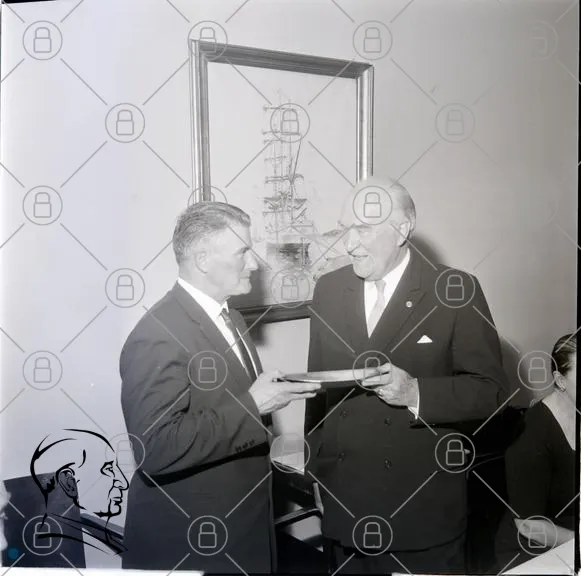 män, möte, presentation, diplom, affärsmän, svartvitt, inomhus, kläder, kostymer, leenden, bord, väggkonst, porträtt, gest, handskakning, 1900-tal, professionellt, samarbete, företag, hedersutmärkelse, diskussion, vänskap, formell, stil, tradition, historia, kultur, representation, artighet, evenemang